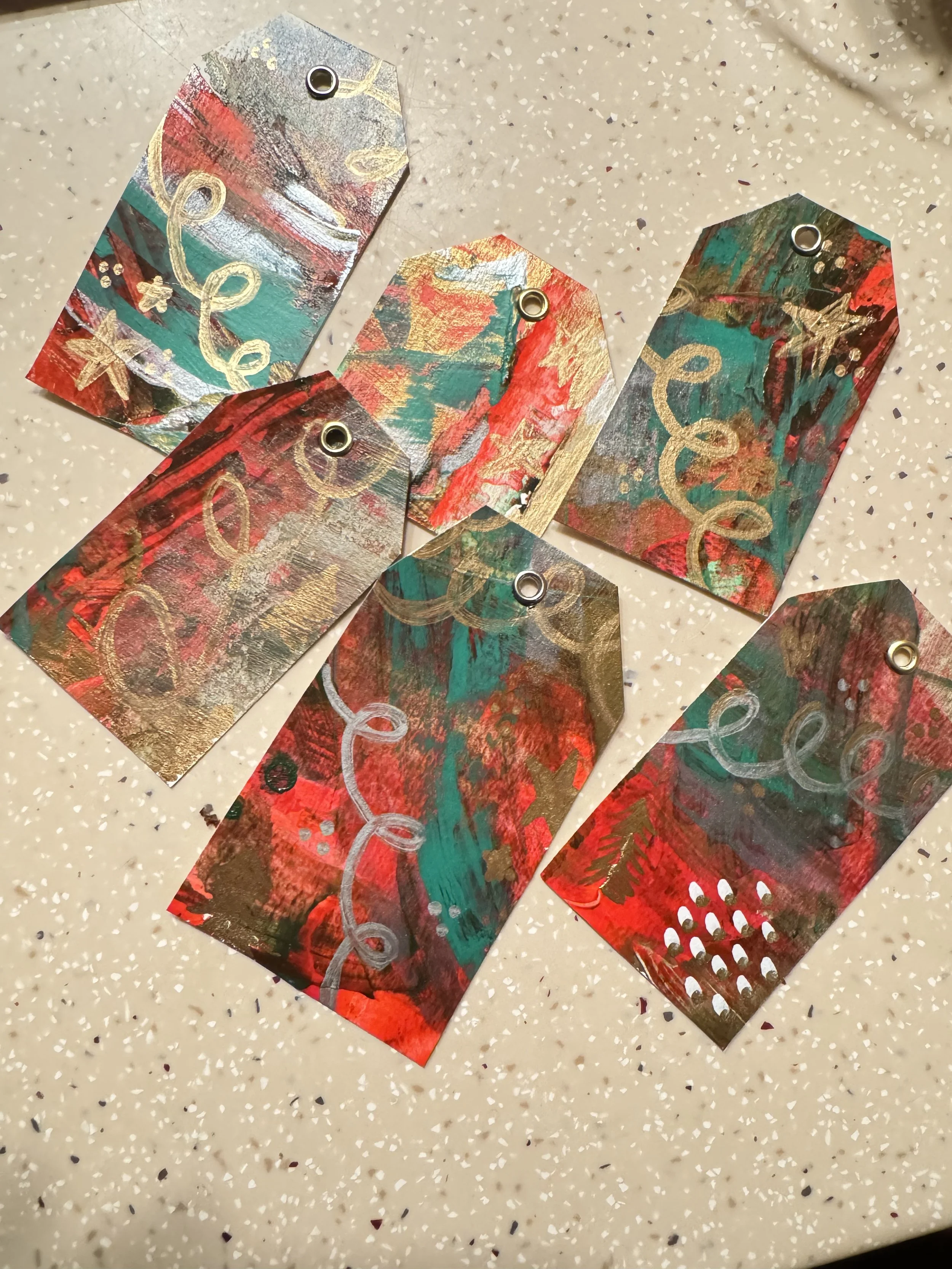 I had a blast turning this plain, white, flat sheet into an awesome photo booth backdrop for my birthday party this year. It was more fun and MUCH cheaper than a pre-made one. Don't forget to use COTTON! Microfiber doesn't accept dye. Using some thick watercolor paper, we used acryllic paints and some paint markers to make our own Christmas gift tags. I had to have some help punching the rivets but I am ready to make some birthday-themed ones for my friends!