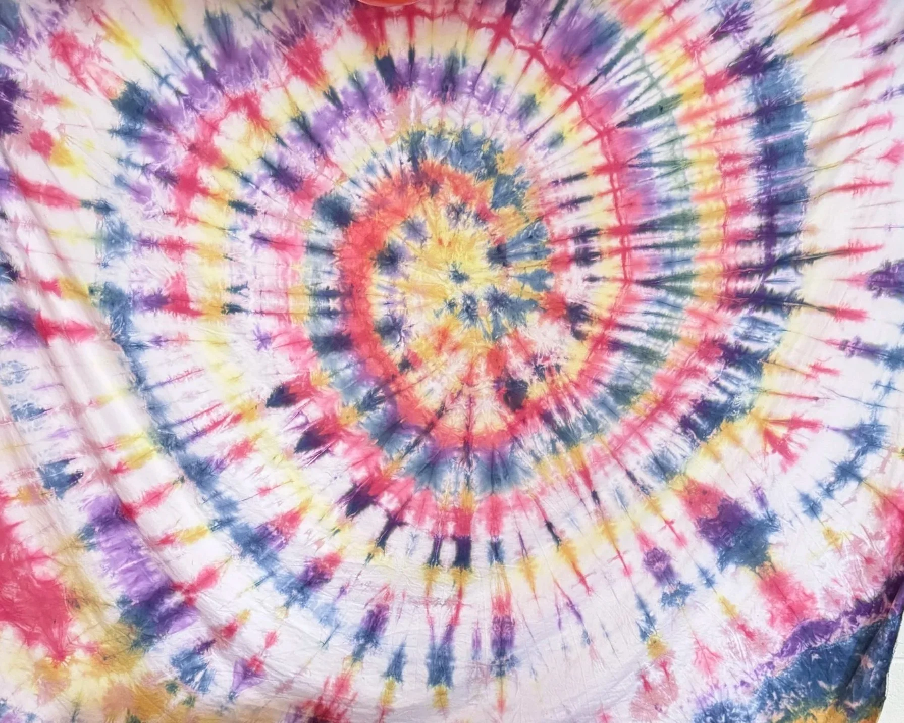 My mom and I went to the thrift store and got some books we thought looked interesting or that had fun paper. After we bought cook books, a garden book, and an art book... we got to work layering crayons, paints, gel pens and sharpies just to see what would happen or what shapes we liked the best. It was a ton of fun for less than $8. Tie-Dye Photo Booth Backdrop
